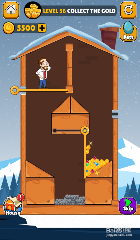 这个关卡的使命是得到黄金,内里有两个插销和一个推拉杆,中年大叔站在熔岩上侧,环境如图。