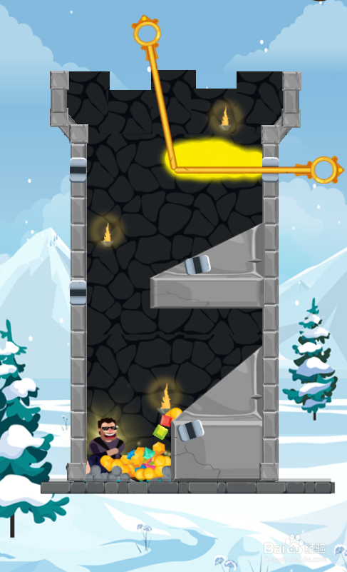 这个关卡的使命是得到底部的宝藏,匪徒站在宝藏左侧,英雄站在左侧顶部,内里共有六个插销,环境如图。