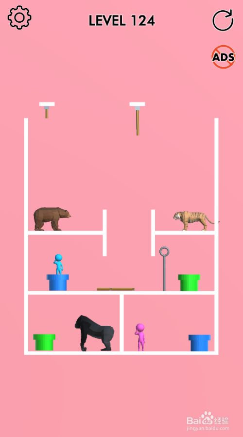 这一关的使命是营救大猩猩右侧的粉色人,蓝色人被绳子吊在棕熊上侧,内里共有三个拉针,环境如图。