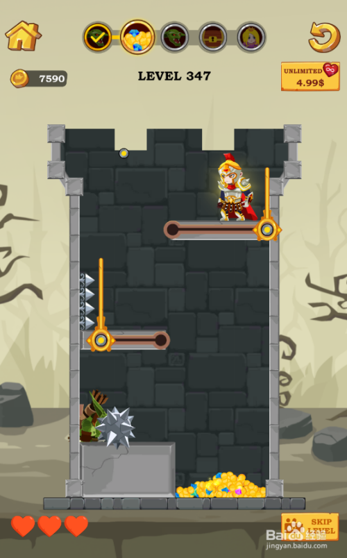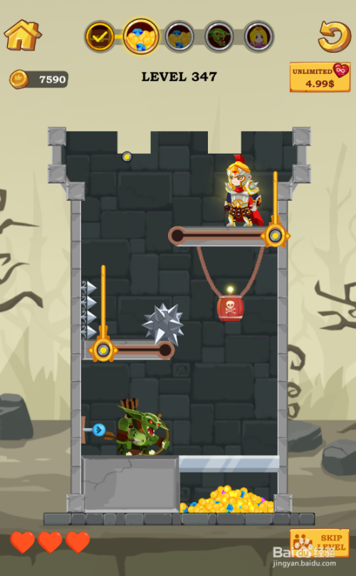 这个关卡的使命是得到底部的宝藏,铠甲少年站在炸药桶上侧,流星锤吊挂在左侧顶部,哥布林站在左侧底部,环境如图。