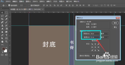 要是我们的册本要的是17cm*21cm,即一页的尺寸,那么在创建的时辰需要设计的是整个书面的尺寸,封面和封底都是17cm,然后中心的书脊要按照书的厚度来计较,好比我们中心的厚度是2cm,那么在创建的时辰就需要两个封面加上中心的书脊厚度的总和,如图所示