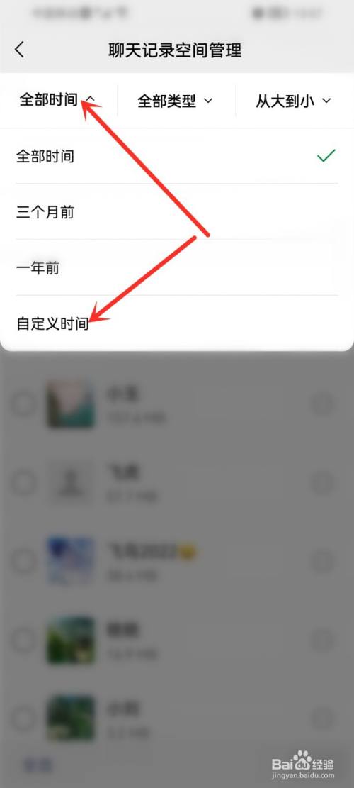 进入谈天记载空间办理,点击左上角“全数时间”选项,在弹出菜单中点击“自界说时间”选项。