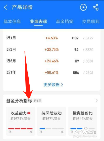 第五步、进入详情页面后,往下拉点击基金阐发指标