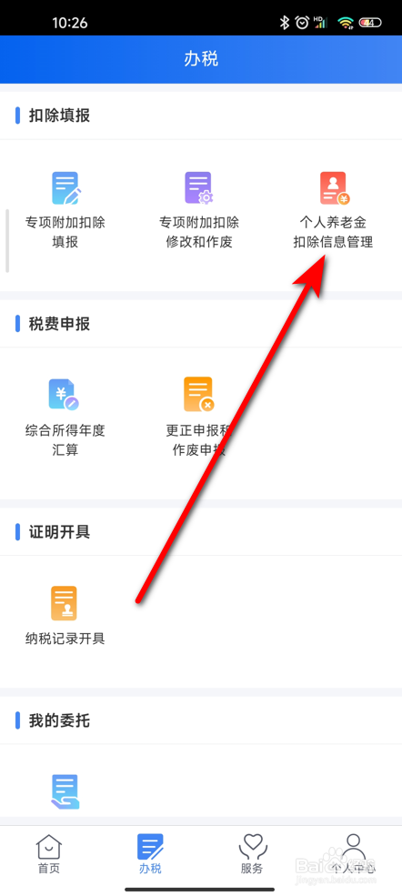 在办税界面选择扣除填报中的【小我私家养老金扣除办理】选项,点击打开。