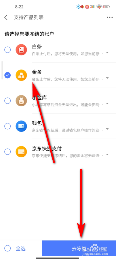 在账户列表中选择【金条】,点击右下角【去冻结】。