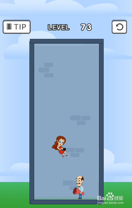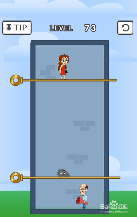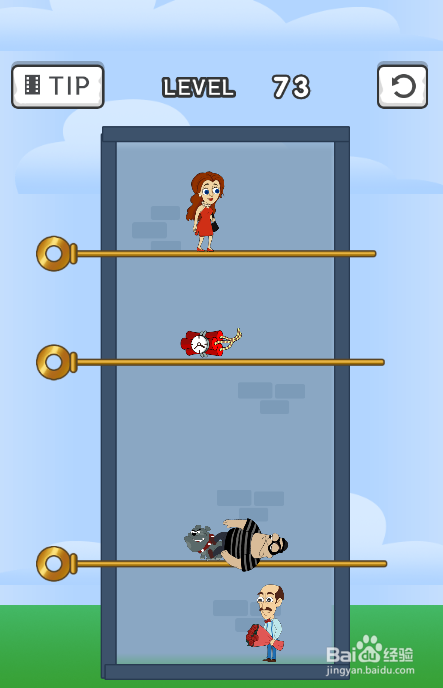 这一关的使命是营救顶部的红衣女子,炸药在红衣女子的下侧,男子站在底部,匪徒站在男子的上侧,环境如图。