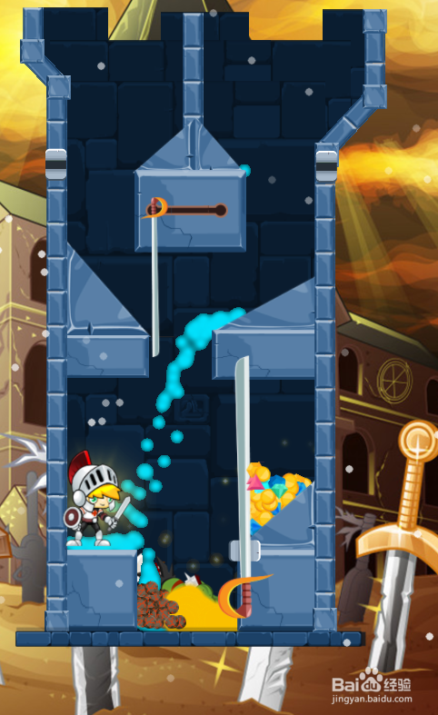 这一关的使命是得到宝藏,少年站在底部平台上,熔岩在左侧顶部,仇敌站在底部,环境如图。