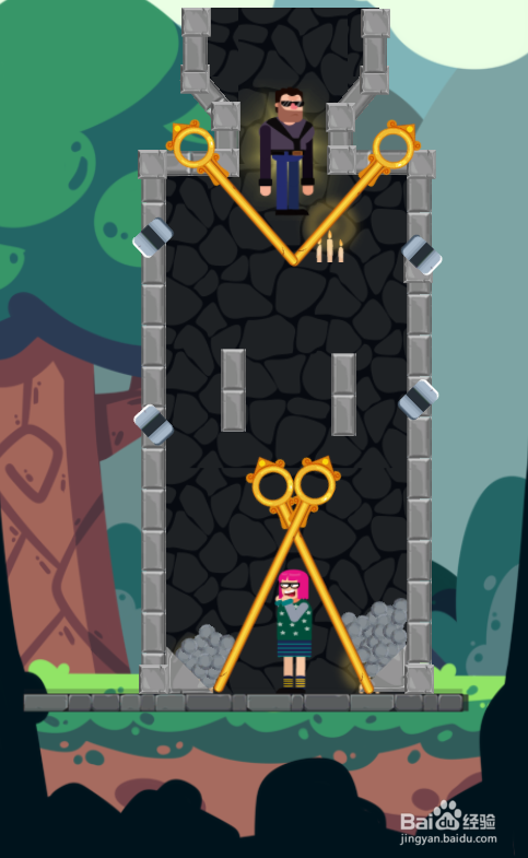 这一关使命是营救底部的红发女生,熔岩在红发女生的外侧,墨镜男士站在顶部,环境如图。