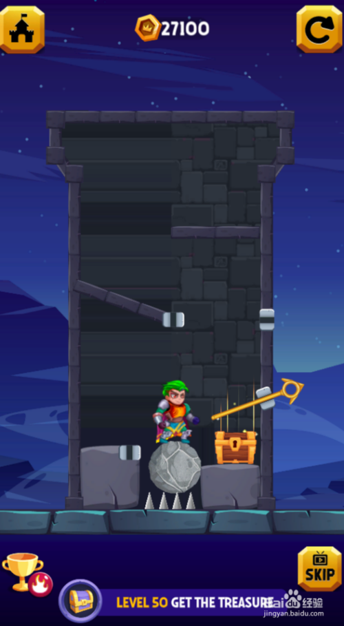 这一关的使命是得到宝箱,巨石吊在顶部,陷阱在底部,少年站在左侧平台上,环境如图。