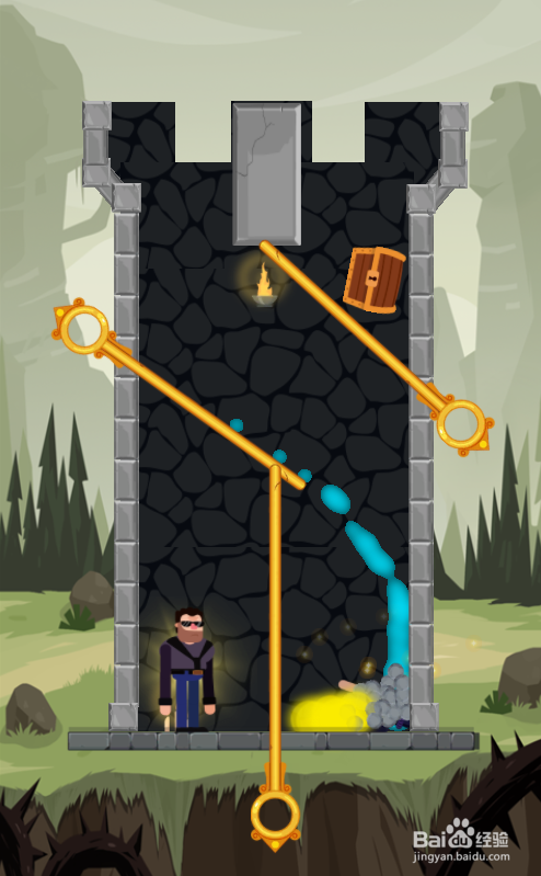 这一关的使命是得到右上侧的宝箱,熔岩在宝箱的左下侧,匪徒站在宝箱的正下方,墨镜男士站在匪徒的左侧,环境如图。