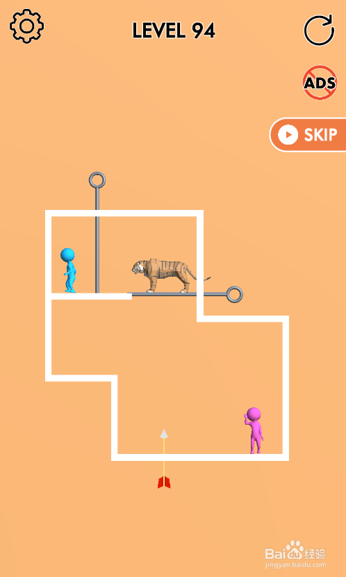 这一关小粉人站在底部右端,棕熊在小粉人上侧,小蓝人站在左侧顶部,山君在小蓝人右侧,内里有两只红羽箭,环境如图。