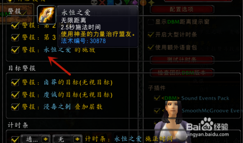 工具/原料戴尔组装WINDOWS10魔兽世界怀旧服2.5.1DBM插件3.68方法/步骤1进入游戏,点击红心图标2点击搜索框,输入DBM字样3勾选DBM,点击配置设置4找到想要设置的副本版块,点击加载版块5找到想要设置的BOSS,点击切换6找到想要设置的特色技术,点击勾选END注重事项只能设置特殊技术的警报