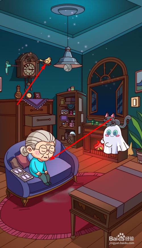 老奶奶惊醒后,点击头上的叹号,再将猫咪拖动给老奶奶。
