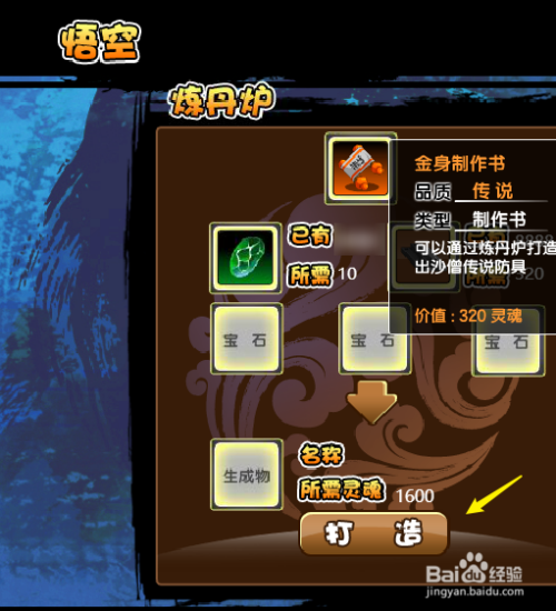 将金身建造书添加到炼丹炉上,再点击”打造“即可。(打造金身需要10个玉衡石,获取要领可以参考以下经验)