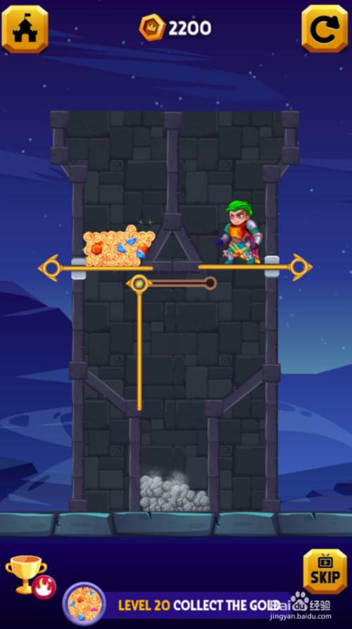 工具/原料一加10 Pro安卓Android 13万夫莫敌2.7.11方法/步骤1这一关勇士站在熔岩上侧,宝藏在左侧顶部,环境如图。2点击滑动熔岩左侧的推拉杆,如图。3点击移除宝藏下侧的拉针,如图。4点击移除勇士下侧的拉针,如图。5点击滑动宝藏右侧的推拉杆,如图。6勇士乐成获得宝藏,弹出通关动画,如图。这样就过关了。END