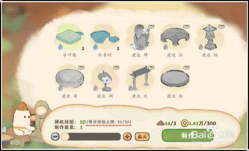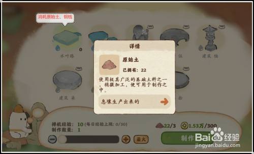 进入禅物坊,点莲花图标打开工坊,每耗损3份原始土、300铜钱可“建造”一个水叶路,水青砖需要耗损矿料,两者都是在息壤处出产。