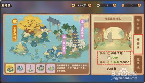 当罗山寺的禅缘到达3级、恬静度到7000,可耗损1万铜钱解锁禅物坊,本家儿要用于建筑各类水上修建。