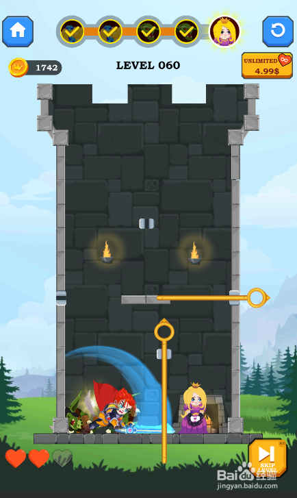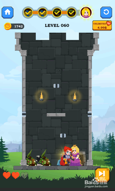 这一关的使命是营救女孩,少年站在左上侧,内里有两个哥布林,环境如图。