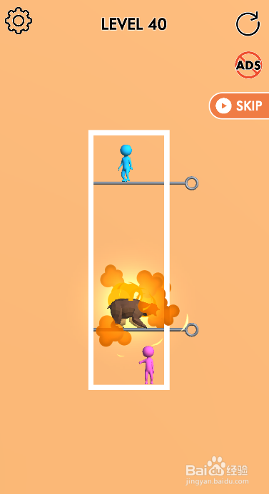 这一关内里共有四个拉针,棕熊在小粉人上侧,小蓝人站在地雷上侧,环境如图。