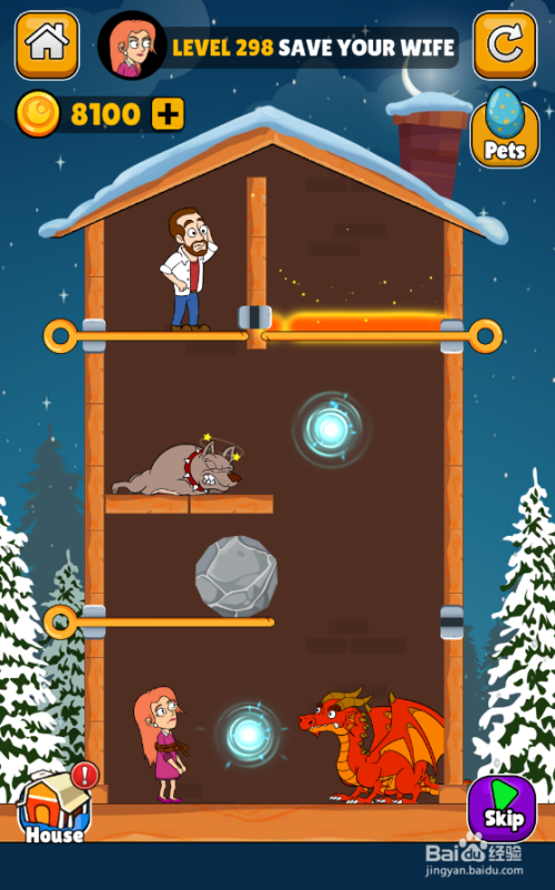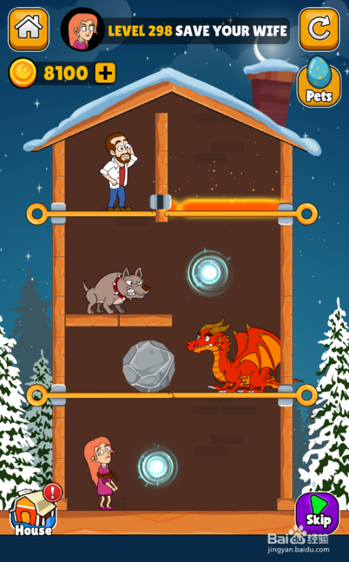 这一关内里有五个拉针,恶犬站在男子下侧,使命是营救老婆,环境如图。