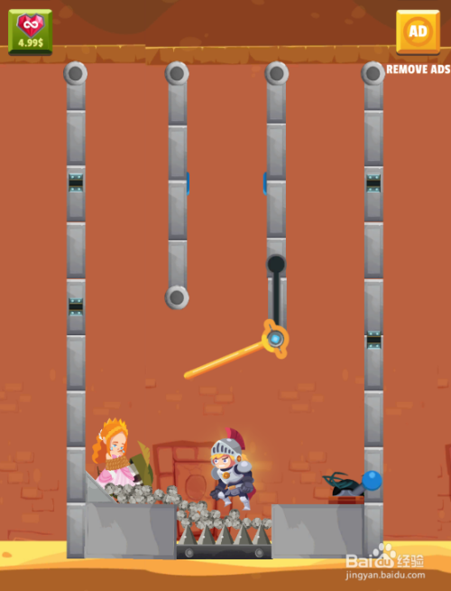 这一关的使命是营救女孩,内里有五个拉针,毒蜘蛛在少年下侧,骷髅人站在女孩下侧,熔岩在陷阱上侧,环境如图。