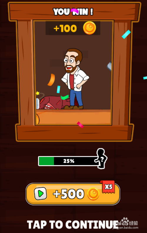 中年男子乐成获得宝藏,得到100金币,如图。这样就过关了。