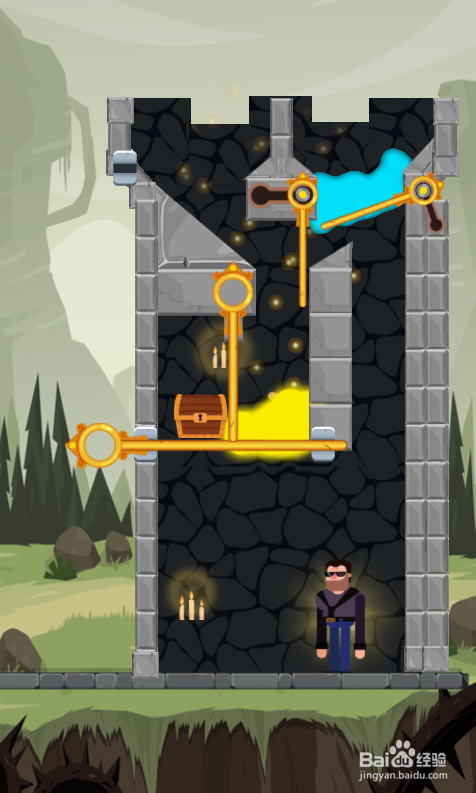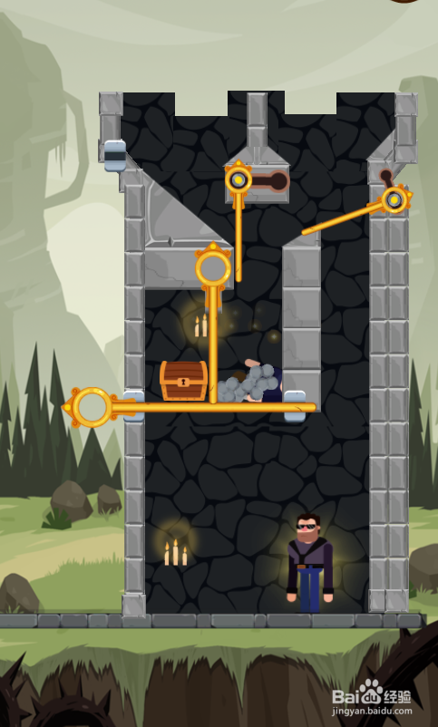 这一关的使命是获得宝箱,匪徒站在宝箱右侧,中年男子站在底部,环境如图。