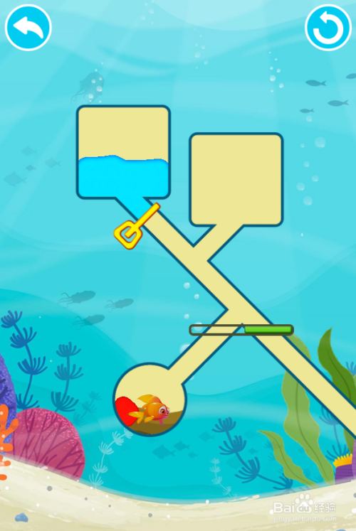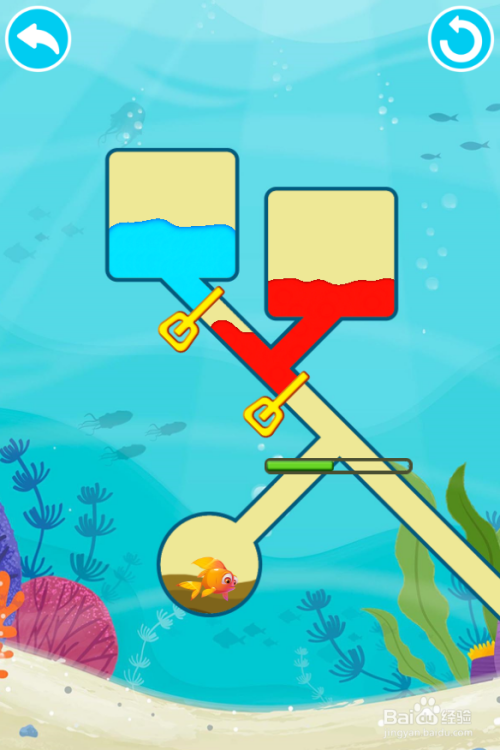 这一关内里有两个拉针和一个绿色滑块,金鱼在左侧底部,水在左侧顶部,熔岩在水右下侧,使命是营救金鱼,环境如图。