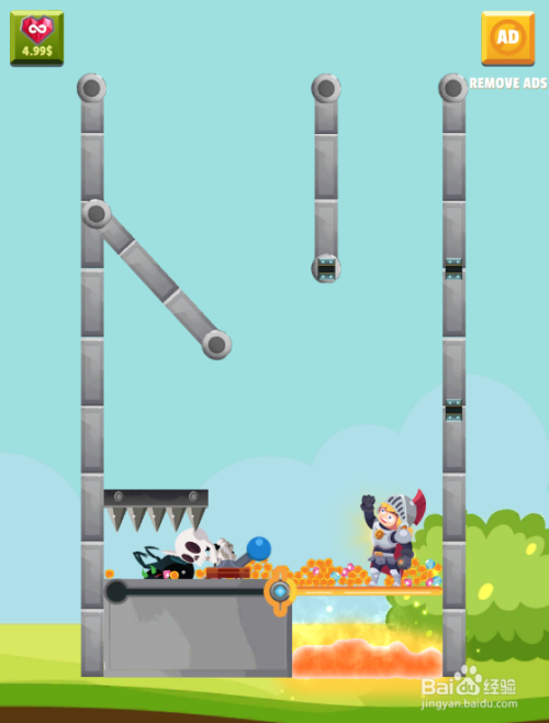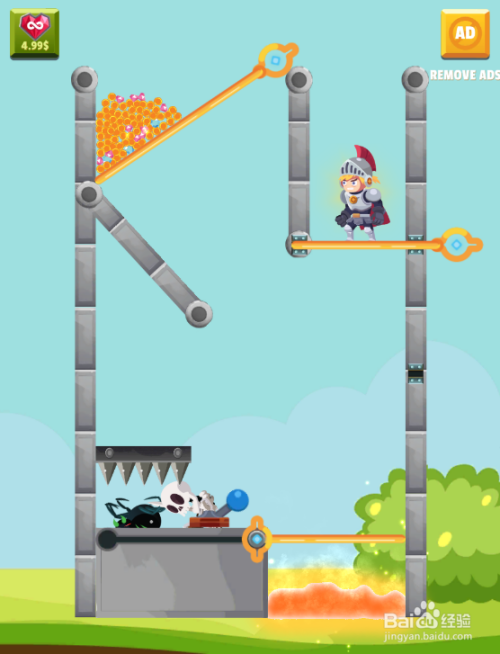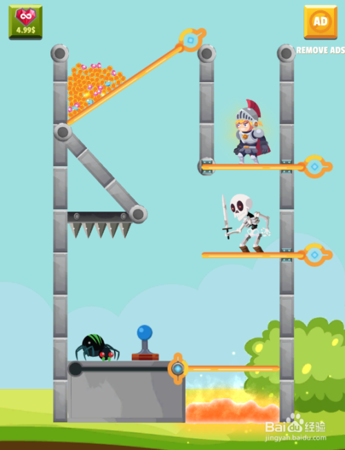 工具/原料一加10 Pro安卓Android 13勇士拉针大冒险1.0.1方法/步骤1这一关内里有四个拉针,骷髅人站在勇士下侧,使命是获得宝藏,环境如图。2点击滑动毒蜘蛛下侧的拉针,如图。3点击移除骷髅人下侧的拉针,如图。4点击移除宝藏下侧的拉针,如图。5点击移除少年下侧的拉针,如图。6少年景功获得宝藏,得到30金币,如图。这样就过关了。END