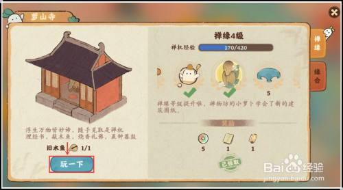 打开罗山寺古刹,点“玩一下”,倒数3秒后就可以不停敲击旧木鱼,敲击次数可转化为禅心增长禅缘。