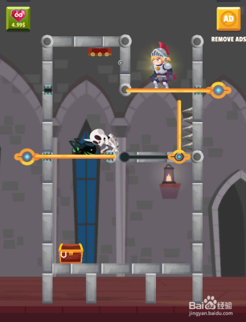 工具/原料一加10 Pro安卓Android 13勇士拉针大冒险1.0.1方法/步骤1这一关内里有五个拉针,使命是获得宝箱,环境如图。2点击移除骷髅人左侧的拉针,如图。3点击移除骷髅人上侧的拉针,如图。4点击移除宝箱上侧的拉针,如图。5点击移除少年下侧的拉针,如图。6点击滑动少年右侧的拉针,如图。7少年景功获得宝箱,得到30金币,如图。这样就过关了。END