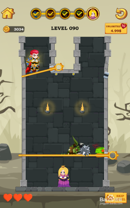 这一关内里有三个拉针,使命是营救公本家儿,环境如图。