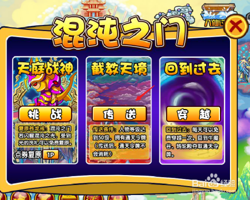 工具/原料演示游戏:造梦西游3演示电脑:华硕540U方法/步骤1在电脑上打开造梦西游3小游戏,点击“读取存档”进入游戏。2点击“混沌之门”。3点击“传送”,传送至截教天境。4点击“蓬莱岛”。5击败该关boss千年蚊妖后即可有几率得到圣域之墙3级技术书。END注重事项创作不易,要是对你有帮忙请给小编点个赞吧。