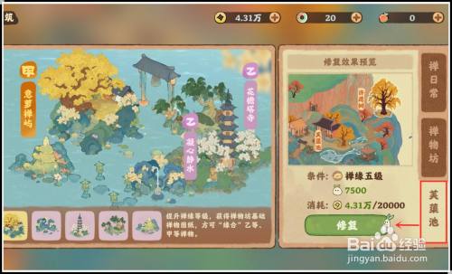 解锁萝山寺后,逐日经由过程在藏经室整理经籍、晨钟暮鼓点喷鼻、禅物坊制作修建等方式晋升禅缘的等级,升到5级可修复芙蕖池。