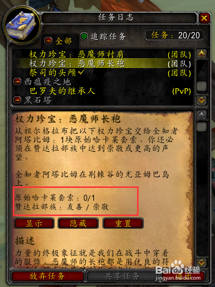 当我们赞达拉部族声望到达崇拜而且随身携带[原始哈卡莱套索]即可去交该使命,获取响应的装备奖励。