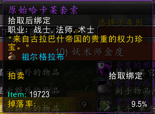 在20人团队副本[祖尔格拉布]中,五个高阶祭司加上血领本家儿曼多基尔和妖术师金度都有几率失落道具[原始哈卡莱套索]。