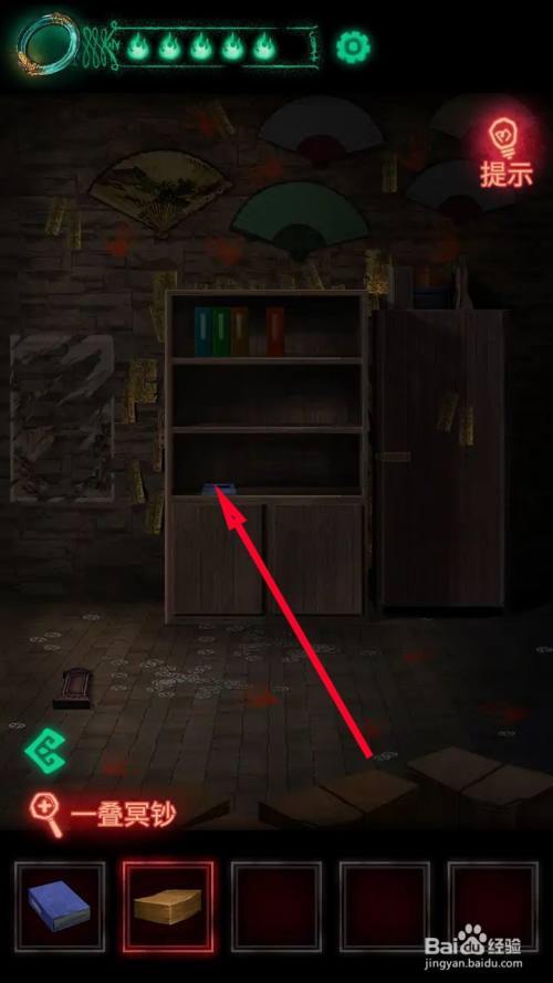 来到地下室看到墙上有个谜题,可是此刻没有提醒,以是先往右边走。来到右边的房间点击书厨上的书。