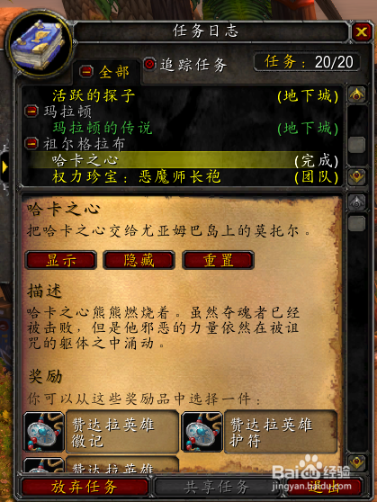 我们需要打完【祖尔格拉布】,击杀最后boss哈卡后,会失落一个紫色使命物品[哈卡之心]。