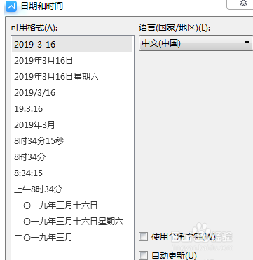 在弹出的日期和时间界面中,可以从左边的列表选择需要用到的格局,选择好之后,记得把右边主动更新前面的勾选上,然后点击确定。