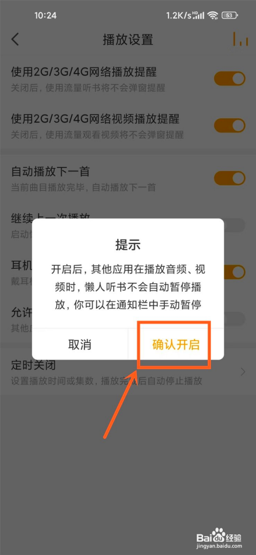 5、点击“确认开启”,即可打开“与其他应用同时播放”功效。
