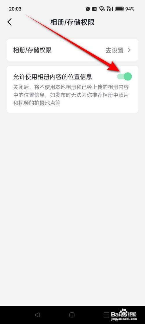 将“许可利用相册内容的位置信息”旁的小滑块点亮即可开启。