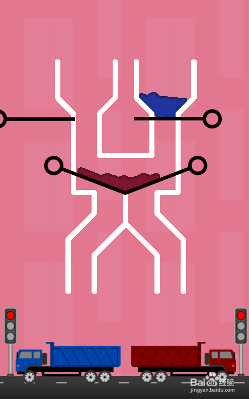 这一关的使命是装红色沙子和蓝色沙子,内里有四个拉针,环境如图。