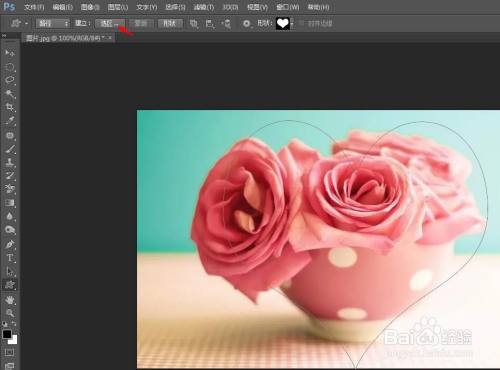 第三步:在图片中,按住鼠标左键画出一个心形,并单击上方东西栏中的“选区”按钮。