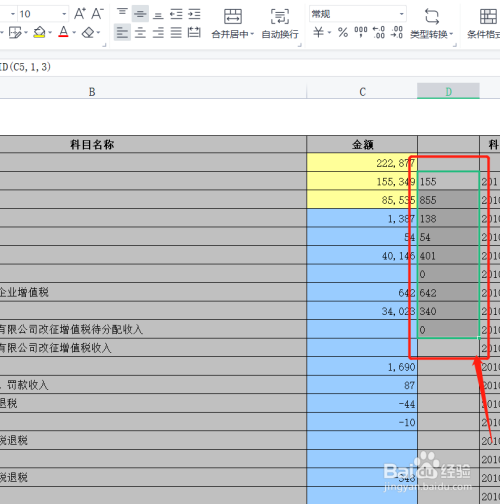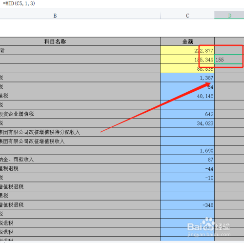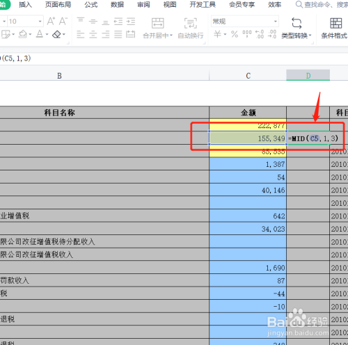 在空缺列输入公式【mid(c5,1,3)】,此中c5为单位格位置代码。