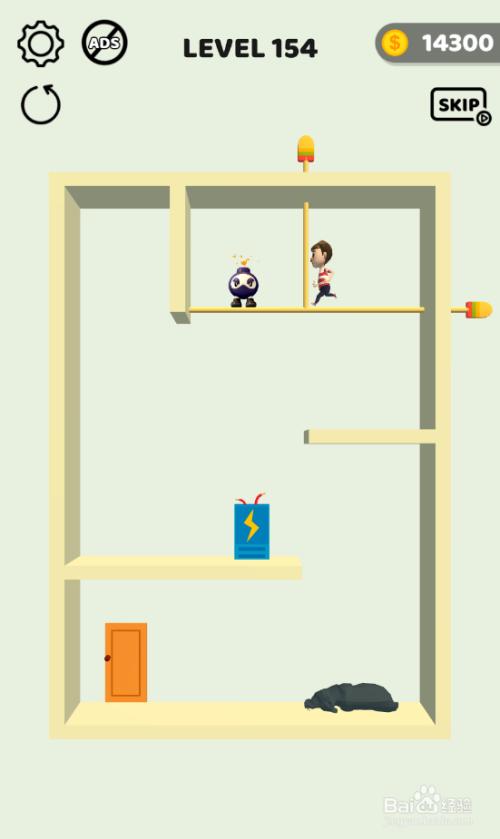 这个关卡的男孩在白虎上侧,安全出口在底部左端,环境如图。