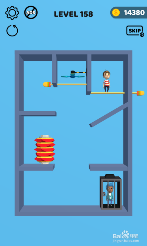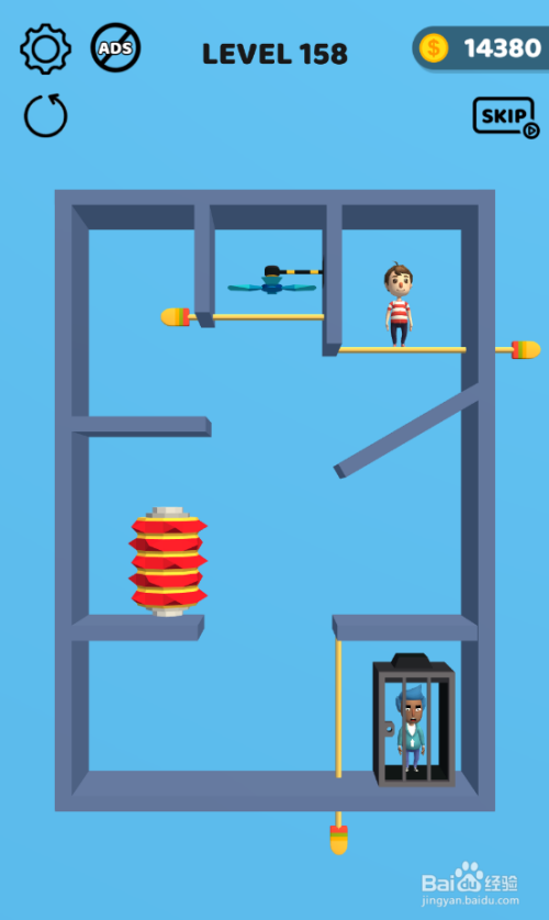 这个关卡的男孩在电扇右侧,使命是营救铁笼内里的小伙伴,环境如图。