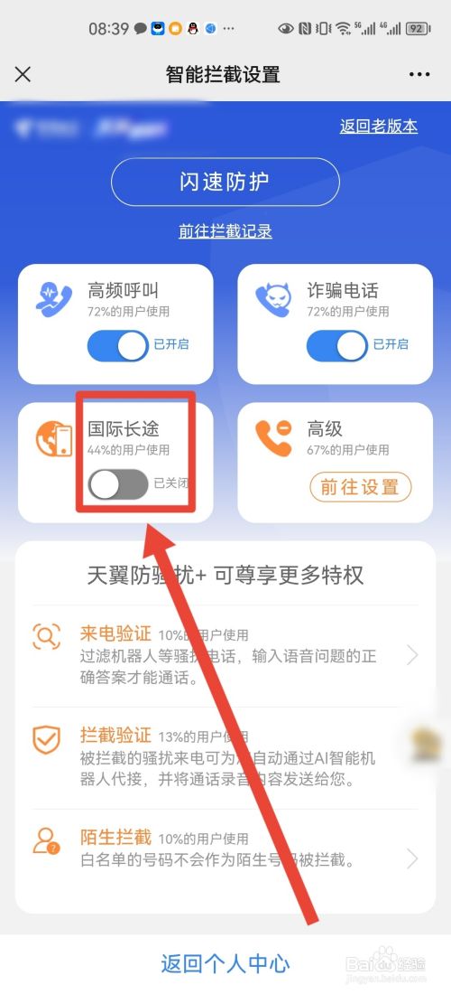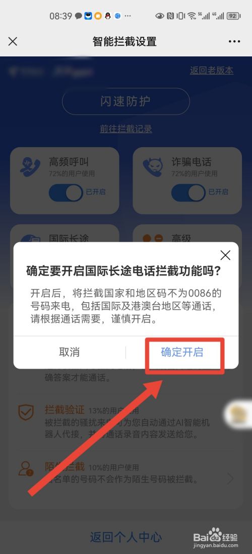 细心阅读阅读危害提醒,点击【确定开启】即可拦截国际远程德律风。