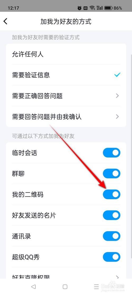 当“我的二维码”旁的小滑块处于点暗状况时即暗示此时扫我分享的二维码时将不克不及添加我为摰友,点击小滑块。