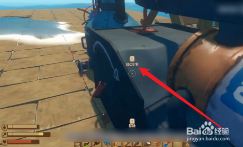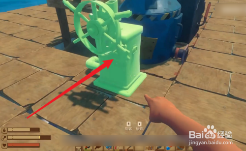 如图所示利用【斧头东西】在木排头部砸开三个格子用来安装引擎