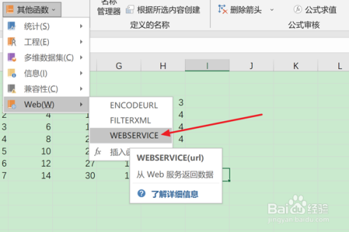 最后在弹出子菜单中,选择“WEBSERVICE”函数项。